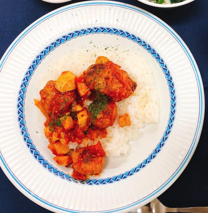 合いびき肉160g、パン粉20g、牛乳80ml、たまねぎ70g、エリンギ130g、パセリ(乾)適量、オリーブ油大さじ2分の1、トマト水煮缶270g、オイスターソース小さじ2、ピザ用チーズ16g、塩少々、水100ml、ごはん600g