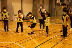 ボッチャは、重度脳性麻痺者もしくは同程度の四肢重度機能障がい者のために考案されたスポーツで、パラリンピックの正式種目にもなっています。ジャックボール(目標球)と呼ばれる白いボールに、赤・青のそれぞれ6球ずつのボールを投げたり転がしたりして、白いボールにいかに近づけるかを競うものです。東海大学の学生も参加し、子どもたちにボールの投げ方などのアドバイスをしていました。参加者が投げたボールが白いボールに近づくと「おー、うまい!」という歓声があがり、ボールが遠くに行ってしまうと「あー」と落胆の声が上がるなど、会場は大いに盛り上がりました。