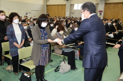 今年は3年に1度の一斉改選の年であり、この日から新たに委員となる66人を含めた243人に対し、奥村俊文南区長から委嘱状が伝達され、各地区の代表者がこれを受け取りました。