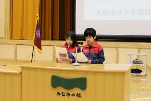 2月17日(土曜日)11時から、市立札幌みなみの杜高等支援学校(札幌市南区真駒内上町4丁目)で、南区少年消防クラブ協議会(豊田妙子会長)の主催による「令和5年度札幌南区少年消防クラブ合同卒団式」が行われました。