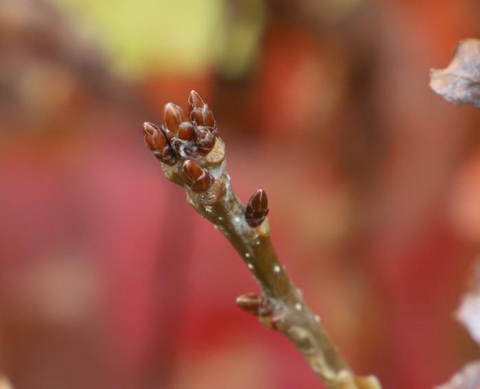 冬芽の形はいろいろありますが、その形の多くは小さな三角形をした魚の鱗(うろこ)のような皮(芽鱗(がりん))が何枚も重なって、春に開く芽を守っています。秋に葉を落とし、冬の間は大事な芽の部分だけ残して寒さに耐えられる形態になるのです。