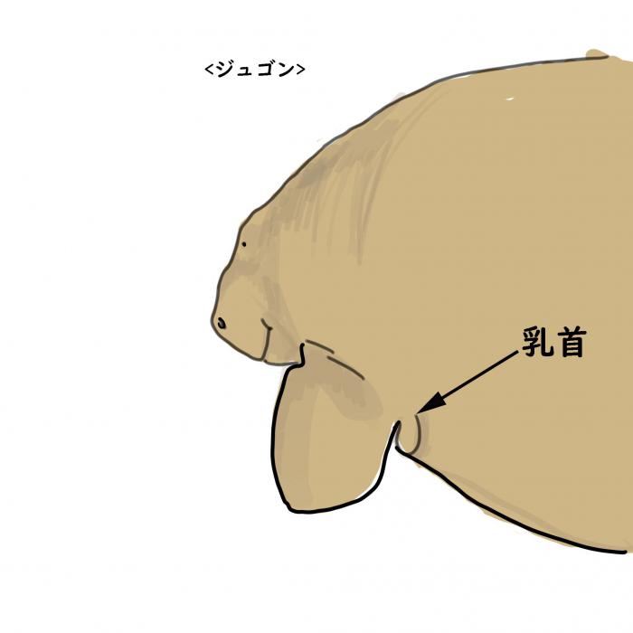 そうだね、カイギュウもほ乳類なので、母乳を飲んで育つけれど、カイギュウの乳首は胸びれ(前腕(ぜんわん))の付け根にあるんだよ。赤ちゃんが母乳を飲む姿、とても愛らしいね。 ※実は前腕の付け根に乳首があるほ乳類は意外に少なく、ヒトを含むサルの仲間やゾウの仲間くらいです。 |