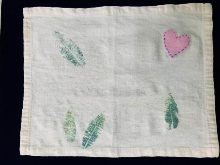 布に葉っぱを並べて、木づちでたたくと、葉っぱの形に染めることができるよ。