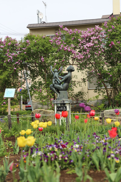 おさない子どもが、交通事こで死んだことをきっかけに、そのような悲しい事こが二度と起きないようにとのねがいをこめて、ちょうこく家・坂坦道によってつくられた像です。昭和52年(1977年)にたてられましたが、10年の間にうでや足にひびがはいるなどしていたんできたため、昭和63年(1988年)にブロンズでつくり直しました。母親の両うでにいだかれて、両手を広げて大空を見上げる子どものすがたは、見る人の心を強く引きつけます。