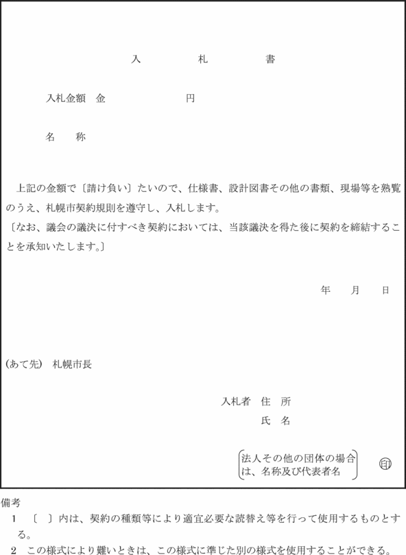 2 入札書は、市長が特に認めたときは、書留郵便又はこれに相当するものにより送付することができる。この場合には、外封に入札書が在中する旨を記載しなければならない。
