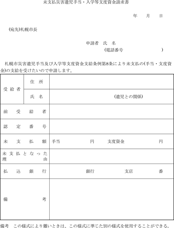 第10条 条例第8条に規定する未支払の手当等を受けようとする者は、未支払災害遺児手当・入学等支度資金請求書(