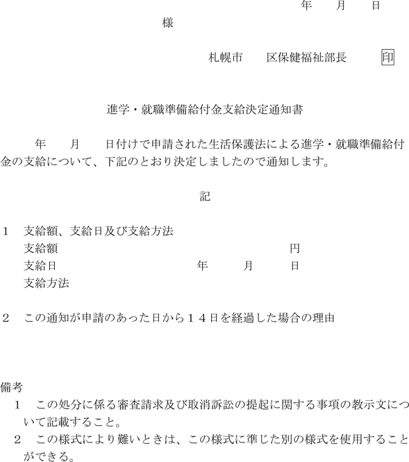 様式9)により、支給しないこととしたときは進学・就職準備給付金支給申請却下通知書(