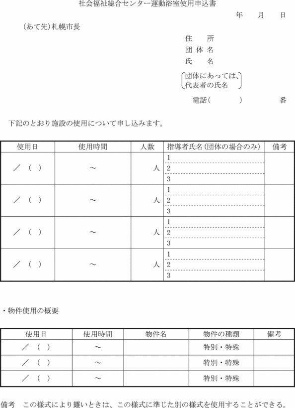 条例第11条第1項の規定により会議室等及び運動浴室の使用に当たって特別の設備を設け、又は特殊な物件を搬入しようとする者は、第1項又は前項の申込書に必要な事項を記入して提出しなければならない。