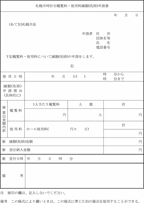 条例第5条第3項の規定により観覧料又は使用料(以下「観覧料等」という。)の減額又は免除を受けようとする者は、札幌市時計台観覧料・使用料減額(免除)申請書(