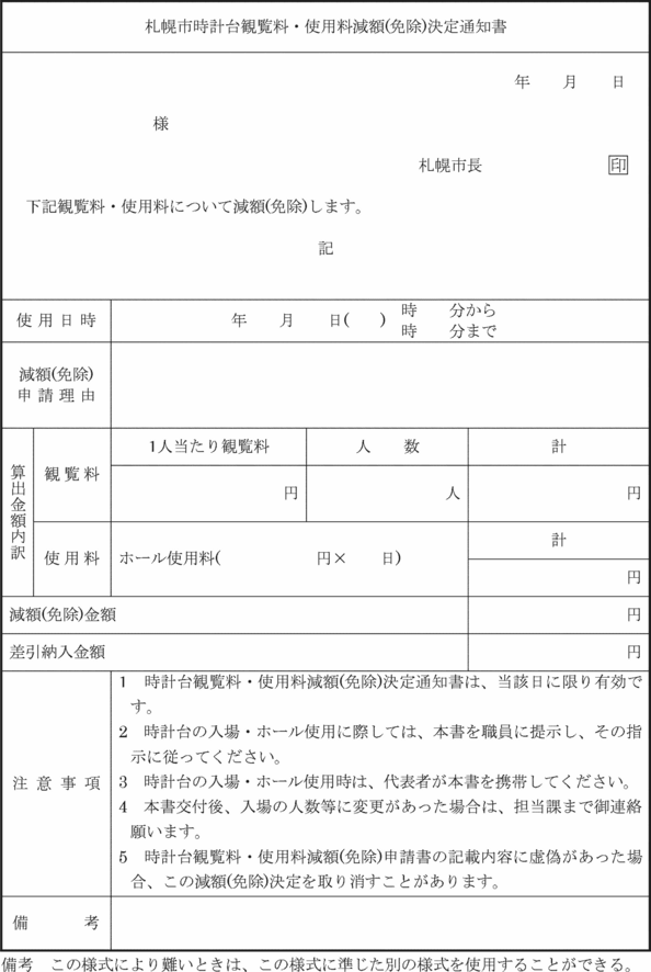 3 市長は、前項の申請書の提出に基づき観覧料等の減額又は免除を決定したときは、札幌市時計台観覧料・使用料減額(免除)決定通知書(
