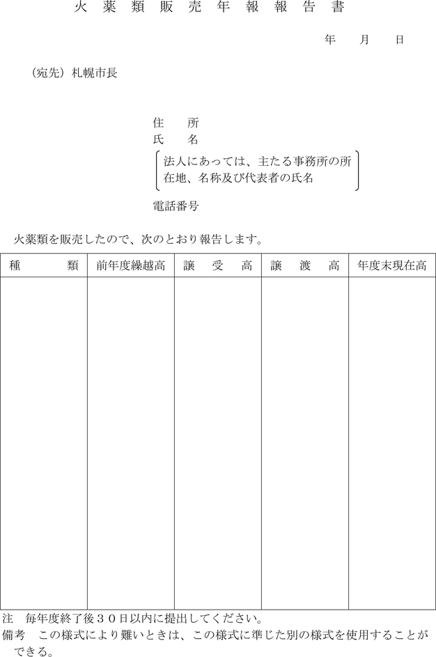第5条 法第11条第1項ただし書の規定により火薬庫外において火薬類を貯蔵しようとする者で、省令第15条第1項の表に規定する安全な場所の指示を受けようとする者は、火薬庫外貯蔵場所指示願(