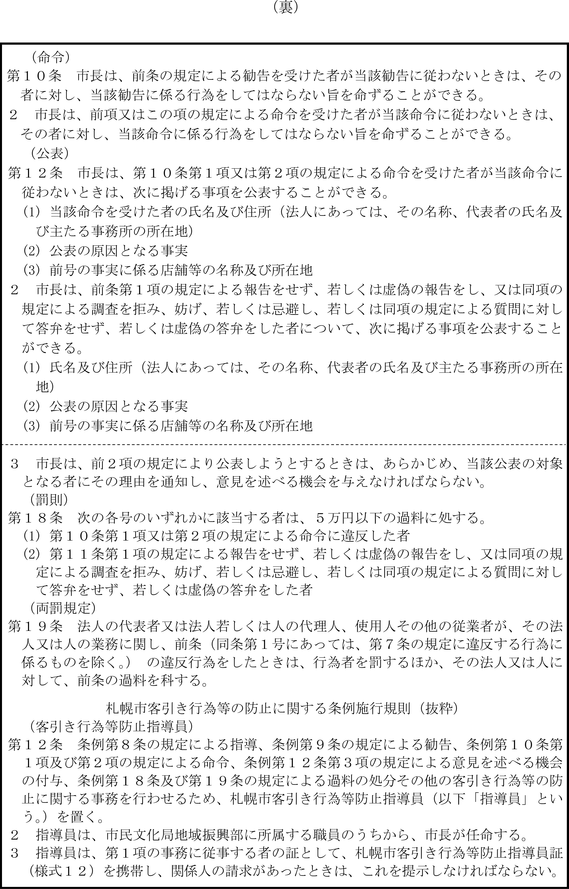 第4条 条例第6条第1項ただし書に規定する規則で定める客引き行為等は、事業者が事業を行う土地又は建物(当該建物の敷地を含む。)(禁止区域に含まれる部分を除く。)が禁止区域に接する場合において、当該土地又は建物と禁止区域との境界線からの距離が1メートル以下の範囲内にある禁止区域(市道南3条線、市道西7丁目線、市道南7条線及び市道真駒内篠路線に囲まれた区域(道路区域を含む。)を除く。)において行われる当該事業者の事業に係る客引き行為等とする。ただし、次の各号のいずれかに該当する客引き行為等については、この限りでない。