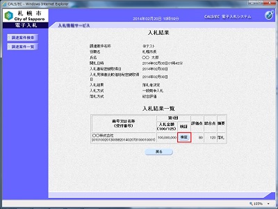 情報を表示したい案件の「入札結果」ボタンをクリック