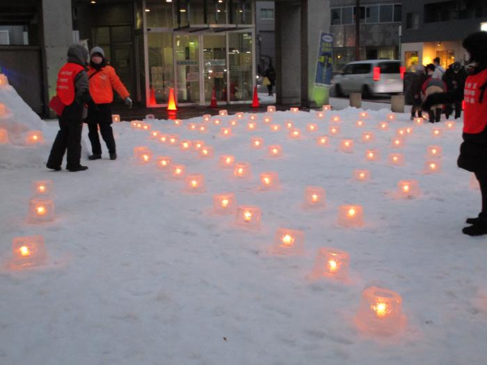 今シーズンは例年にない少雪の冬となり、キャンドルを並べる土台作りに苦労しましたが、八軒連合町内会や八軒地区青少年育成委員会の皆さんにより作られた雪のステージに、約150個のアイスキャンドルが並べられました。従事された皆さん、寒い中での作業お疲れ様でした。