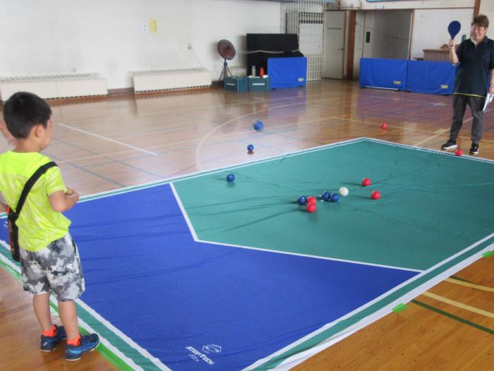 会場には、連合町内会青少年部、発寒北地区の福祉のまちづくり推進センター、青少年育成委員会、民生委員・児童委員協議会などが遊びのコーナーを設置し、お子さんやお孫さんを連れて参加された方など約60人が世代を超えて、さまざまな「昔あそび」を楽しんだほか、フロアカーリング、ボッチャなどの新しいスポーツも体験しました。