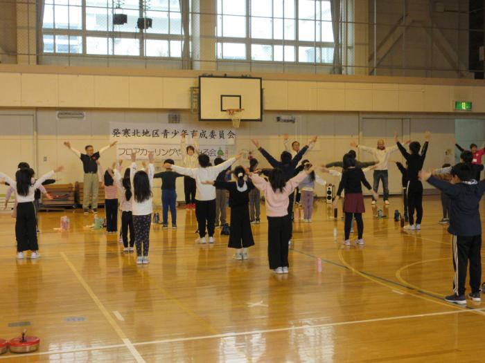 令和6年11月23日(土曜日・勤労感謝の日)、発寒小学校体育館において「フロアカーリングやってみる会」が開催され、約30人の子どもたちが参加しました。