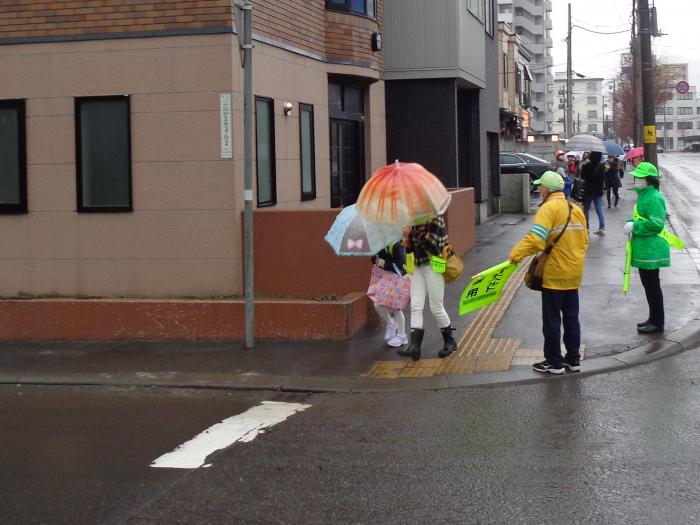 この日は、あいにくの雨模様とはなりましたが、各連合町内会の皆さんが、通学する子どもたちと挨拶を交わしながら、子どもたちの誘導と指導を行うとともに、「スピードダウン」や「シートベルト着用」などと書かれた黄色い旗を持って、ドライバーに交通安全を呼び掛けました。
