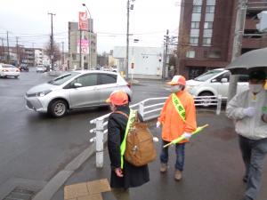この街頭啓発は、新入学、新学期を迎える子供に、交通事故防止を呼び掛けることなどを目的に、琴似二十四軒地区の各連合町内会が実施したものです。