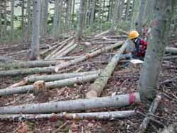 過密植栽により、立ち枯れていた枯損木を伐倒。玉切りして、林床に寝かせます。腐食を促進し、土に還す手助けをしました。