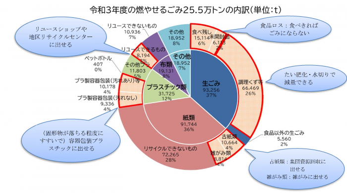 令和3年度の燃やせるごみの組成は、生ごみ(9.3万t)、紙類(9.2万t)、プラスチック類(3.2万t)の順に多くなっていました。そのうち、未開封品や食べ残しといった食品ロスが2.1万t、集団資源回収に出せる古紙類が1.1万t、雑紙に出せる紙類が0.9万t、容器包装プラスチックに出せるものが1.9万tありました。