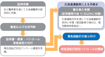 平成18年(2006年)7月、「道路運送車両の保安基準」において「自主防犯活動用自動車」が定義され、警察から証明を受けた団体については、防犯パトロールに用いる車両に青色回転灯を装備することが認められました。すでに多くの自主防犯団体や市町村では、青色回転灯を用いた防犯パトロールが実施されています。