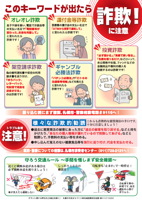 札幌市では特殊詐欺の被害が増加傾向で、平成25年の被害総額は約3億4,000万円に上っており、寄贈されたチラシを町内会や配布に協力していただける地域安全サポーターズなどを通じて市民に配布するなどして注意喚起を行っていく予定です。