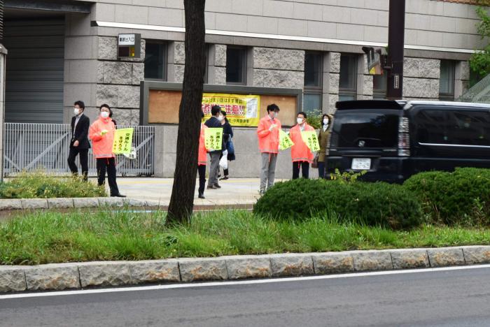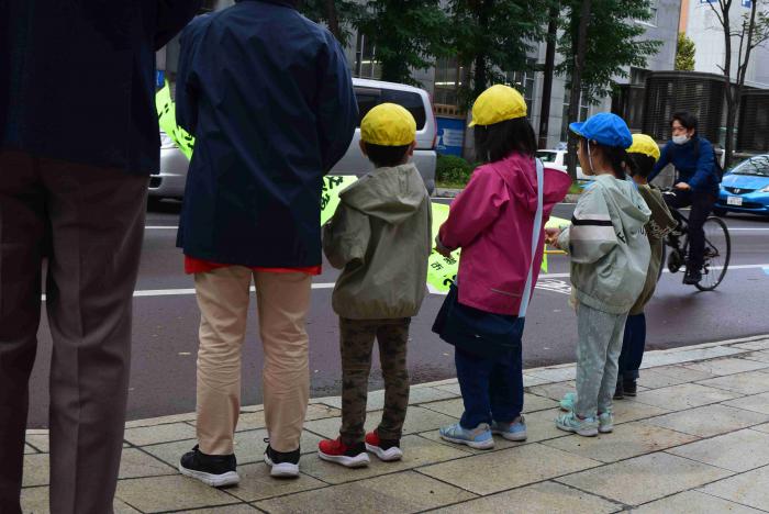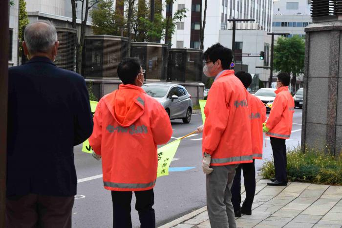 午前8時15分から15分間、小旗を掲げた参加者が並び、旗の波を作りました。