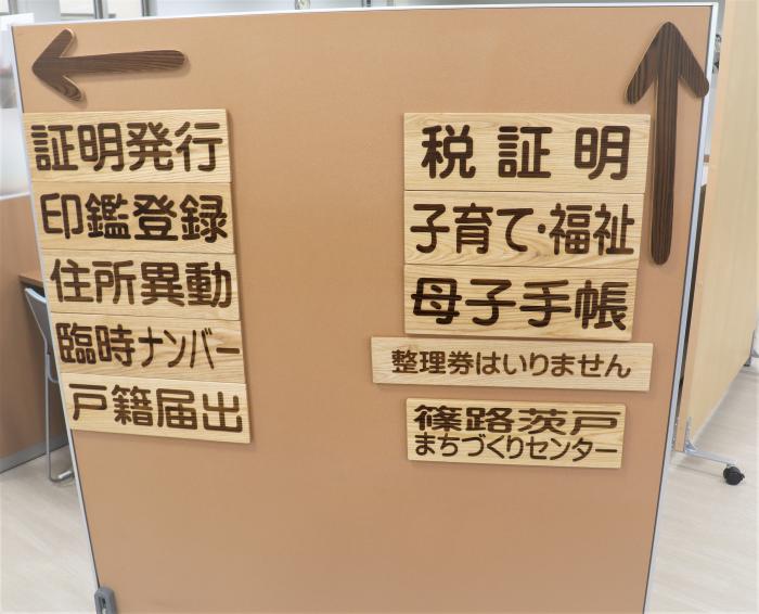 篠路出張所増築棟(以下、「所内」という。)の運用開始に伴い、市立札幌豊明高等支援学校在校生(東藤さん・眞下さん)が作成した木製の職員名札及び窓口案内板等を寄贈して頂きました。これらは、篠路出張所が目指す温もりや親しみやすい雰囲気づくりに大変役立っております。
