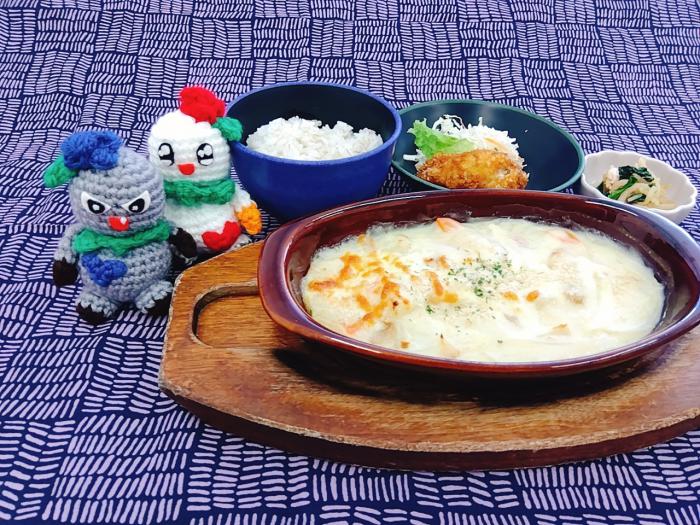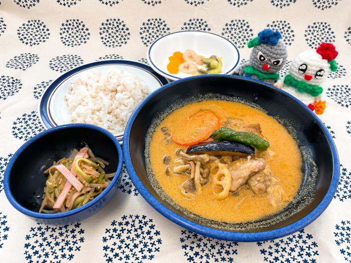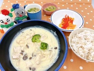 麦入りごはん/豚肉と白菜のスープ煮/シイタケのマヨ焼き/かぼちゃの塩バターきんぴら/フルーツティゼリー(PDF:259KB) |
