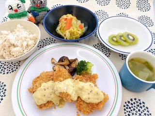 麦入りごはん/豚肉のヒレカツ~粒マスタードソースかけ~/キャベツの洋風煮/かぶと海老のスープ/果物(PDF:385KB) |