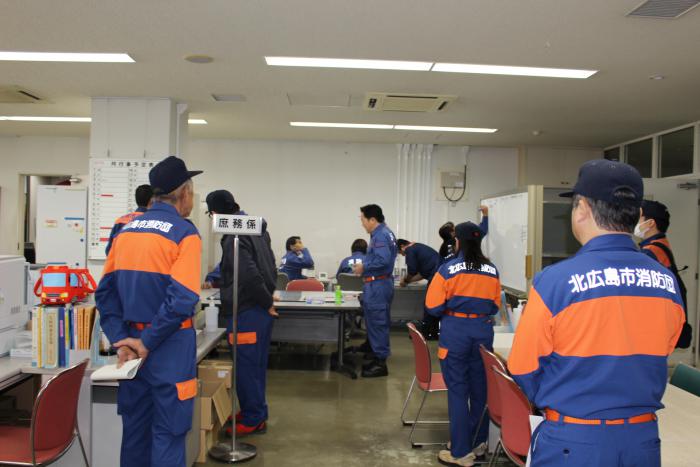 また、この訓練を見学するため、北広島市消防本部及び北広島市消防団から総勢14名の視察団が訪れました。訓練後には、意見交換を行い、お互いに貴重なお話を聞くことができました。
