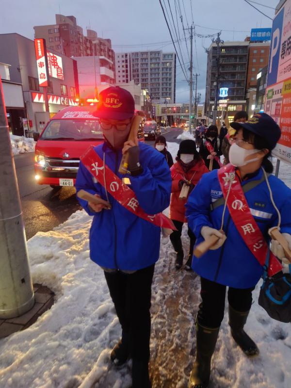 令和4年12月27日(火曜日)16時00分から、手稲中央少年消防クラブが手稲駅前商店街で年末の防火パトロールを実施しました。