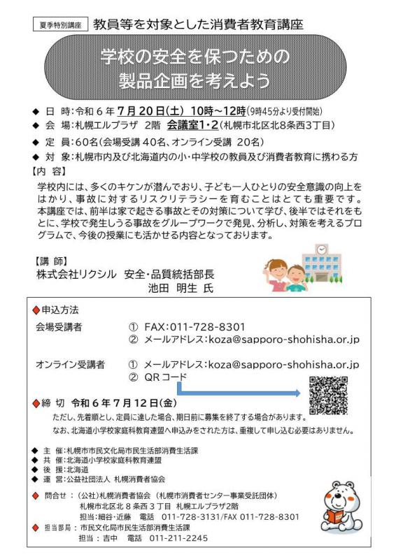 対象:市内及び道内の小・中学校の教員、消費者教育に携わる方 定員:会場受講40名、オンライン受講20名 |