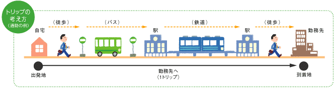 なお、パーソントリップの「トリップ」とは、下図のとおり人がある目的のため、出発地から到着地まで移動することを指し、交通計画を検討する際の単位として使われます。