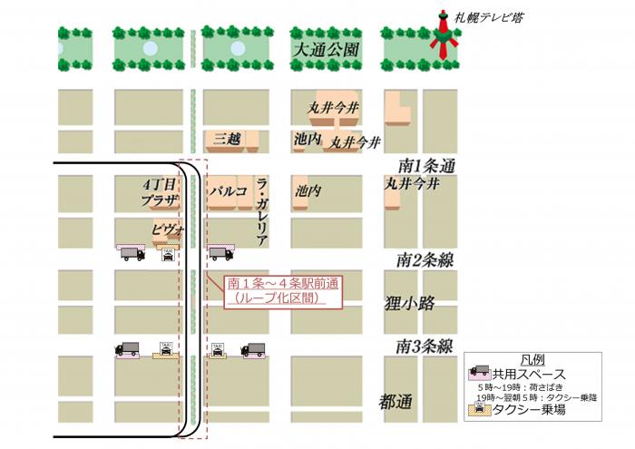 駅前通のループ化区間では、駐停車ができません。南2条線、南3条線に設置しております、タクシー乗場と、荷さばきスペースをご利用ください。