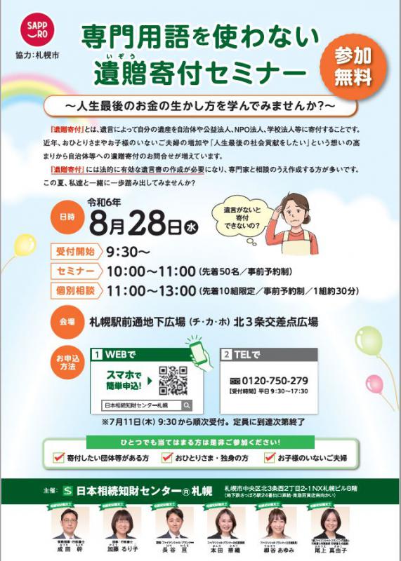 日本相続知財センター札幌との協定締結を契機として、市民の皆様に、遺贈寄付や相続に係る手続き等を分かりやすくお伝えするとともに、札幌市への遺贈寄付についてご紹介するため、以下のとおり共催セミナーを実施しました。