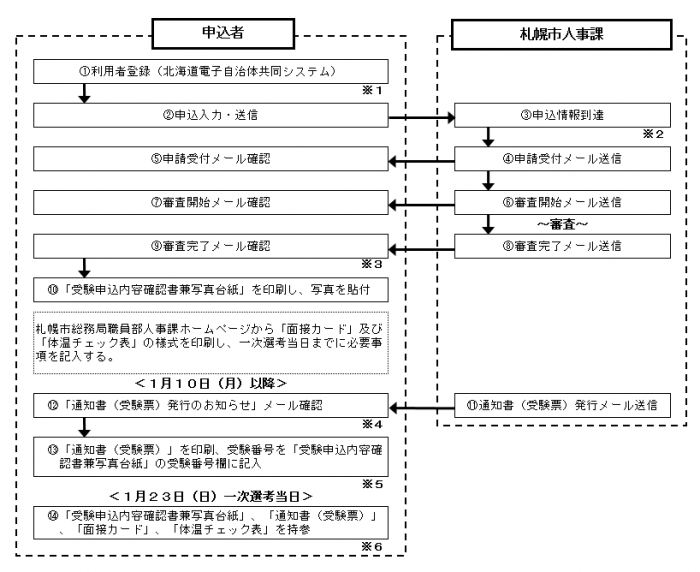 ※4:「11通知書(受験票)発行メール」は1月10日(月曜日)以降に送信予定です。1月17日(月曜日)時点で届かない場合には、1月19日(水曜日)までに札幌市総務局人事課(011-211-2072)へ問い合わせてください。