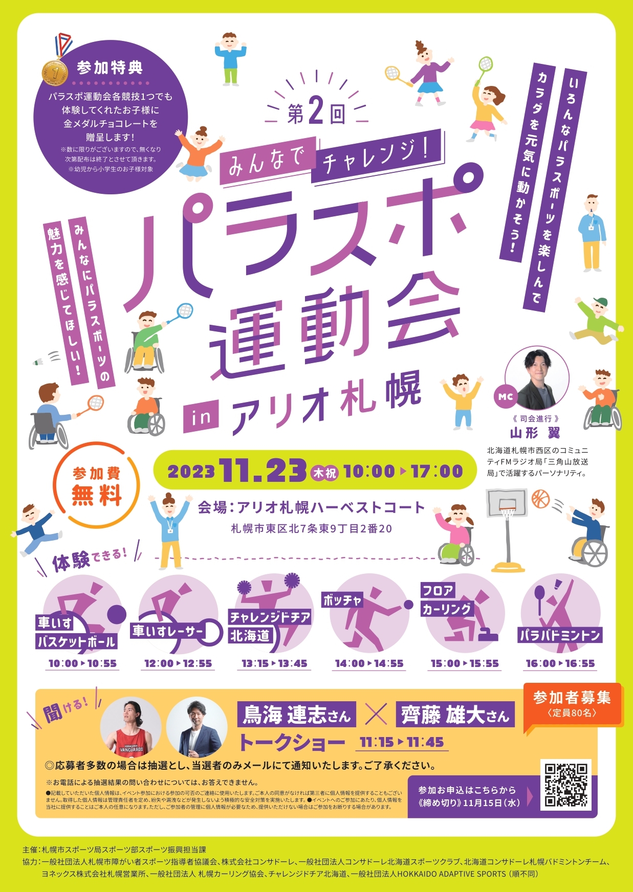 パラスポーツに実際に関わっている方のトークショーを聞いたり、競技を体験したりすることで、パラスポーツの魅力を感じることができる、パラスポーツ応援イベント「みんなでチャレンジ!パラスポ運動会 in アリオ札幌」を開催します。