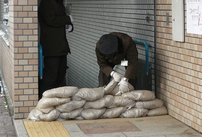 駅の浸水を防ぐための設備として、一部の駅出入口には「止水板」を設置しています。そのほか「土のう」や「浸水防止シート」を各駅に設置しています。