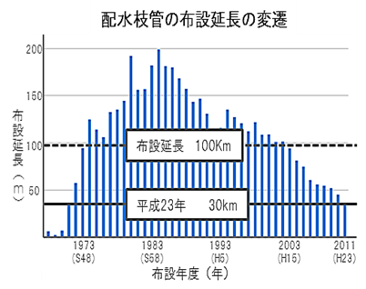 札幌市の配水管は、市勢の拡大に併せて集中的に整備され、現在までに約6,000kmが布設されております。このうち、約4,800kmを占めている配水枝線(口径75mm~350mmの配水管)は右図にあるとおり、1年間に100km以上布設している年度があり、これは計画策定直前である平成23年の布設量30kmと比べ3倍以上になります。