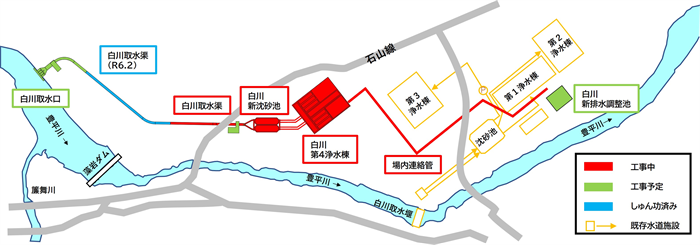 白川浄水場は、第1・第2・第3の3つの浄水棟からなる、札幌市最大の浄水場です。場内の多くの施設で耐震性能が不足しているとともに経年劣化が進んでいることから、段階的に改修を行います。改修は、ひとつずつ浄水棟を停止して行う必要があり、その際に低下する給水能力を補うため、第1期改修事業として、新たな浄水棟(施設名:白川第4浄水棟、処理方式:凝集沈澱・急速ろ過、給水能力:160,000m3/日)を整備するとともに、エネルギー使用量の削減を目指し、原水を豊平川から取り入れる地点を見直して、自然流下を有効に活用できる新たな取水施設を整備します。