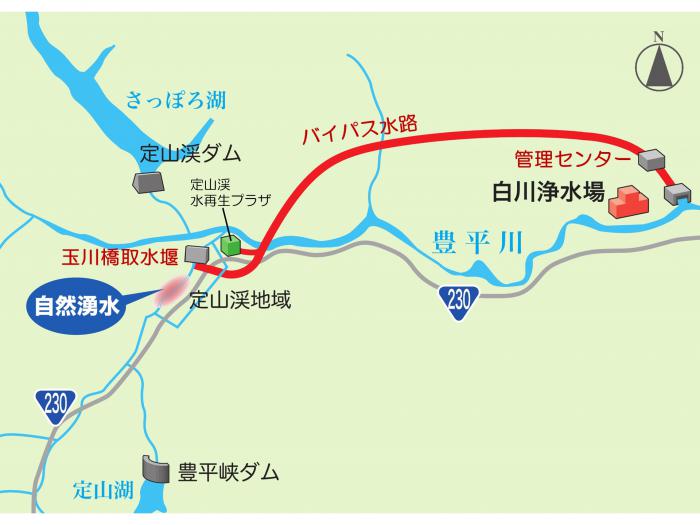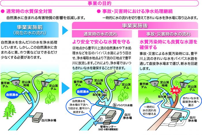本市水道水源の約90%をまかなう豊平川の水源水質を将来にわたって保全していくために、豊平川上流域におけるヒ素、ホウ素などの水質悪化の要因を排除するとともに、災害発生時においても良質な原水を確保することを目的として、「※バイパスシステム」を構築する事業です。(下記イメージ図参照)