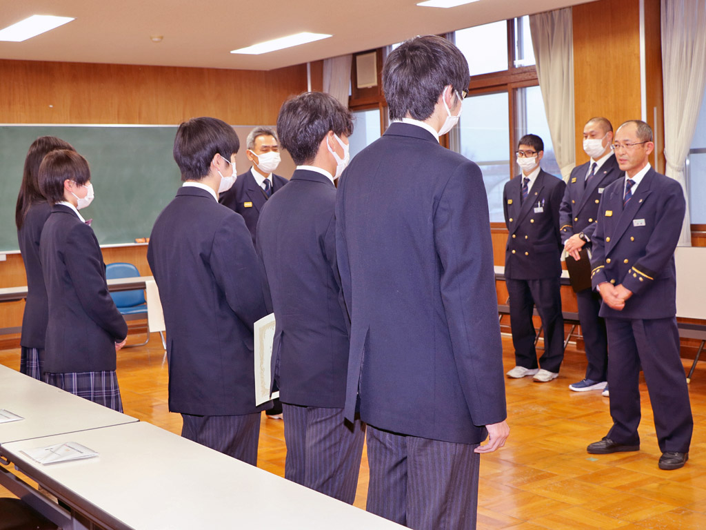 感謝状贈呈式では、カレンダーに採用された作品の作者である6名の生徒(野呂隼斗(のろ・はやと)さん、多田楓(ただ・ふう)さん、渡部真桜(わたべ・まお)さん、寺沢康希(てらさわ・こうき)さん、髙橋美優(たかはし・みゆう)さん、宮﨑華香(みやざき・はるか)さん、)に対し、赤塚英樹(あかつか・ひでき)手稲消防署長から感謝状と記念品が授与され、「見るたびに別のメッセージを感じるような素敵な作品をありがとう」と謝辞が述べられました。また、上野校長から生徒らに対し、「まちづくりに携わった貴重な経験として誇りを持ち、今後の生活に生かしてほしい」と激励の言葉が贈られました。