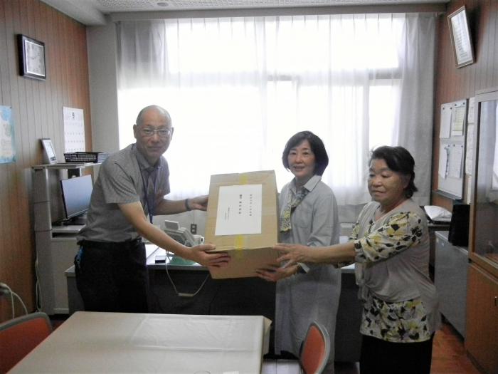 いきいきサロンの代表が前田中央小学校に雑巾を寄贈しました