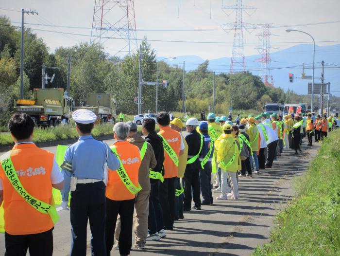 開会式では、開催市の石狩市環境市民部長から「事故のない社会の実現は難しいかもしれないが呼びかけを続けることが大切」といった挨拶があり、その後、参加者は交通量の多い国道337号線に出て交通安全旗を掲げての啓発活動を行いました。