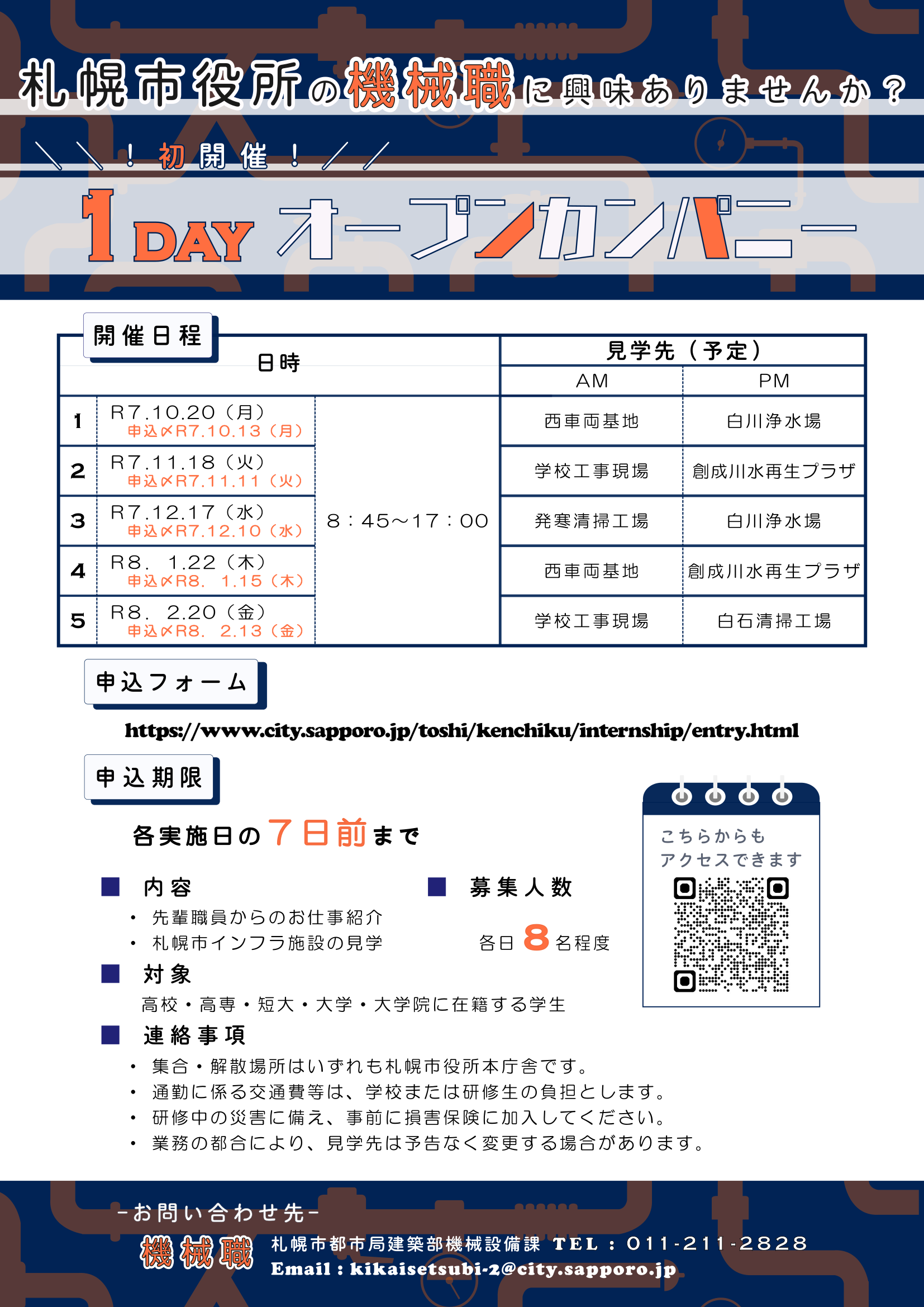 令和7年度建築職オープンカンパニー及び電気職・機械職キャリア教育を開催します。参加をご希望の方は、以下の募集案内をご確認いただき、申込フォームより直接お申込ください。