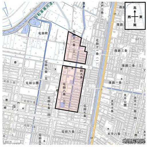 なお、概略図は国土地理院の地理院タイルに方位及び区画整理事業の施行範囲を追記して掲載しています。