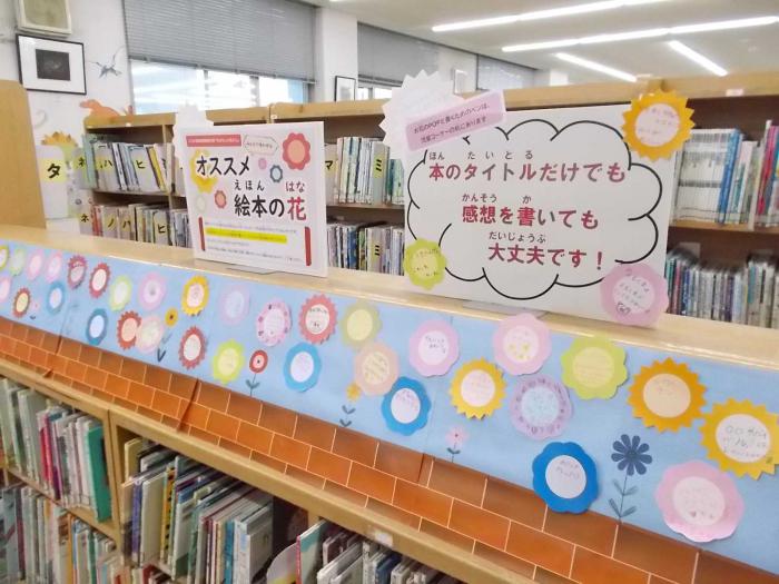 みなさんでオススメの絵本を「お花ポップ」に書いて、元町図書館にたくさんの花を咲かせてください。