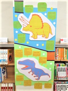 ほんだなのよこや、かべなどこどもの本コーナーのあちこちにきりがみのきょうりゅうたちがいるので、さがしてみてくださいね。