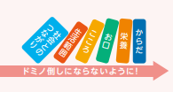 これら3つのフレイルが連鎖していくことで、介護が必要な状態へ急速に進んでいきます。フレイルの入り口は、からだ・栄養・お口・こころ・生活範囲・社会とのつながりなど、人によって様々です。一つの入り口からドミノ倒しにならないように、早めにフレイル予防に取り組むことが大切です。